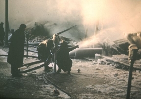 I haven't lived in Mount Carmel since 1955, but I came across your Web site and thought I'd send a couple of photographs from the'50's for your collection. The two pictures of firefighters battling a winter blaze were taken about 1952--the fire occurred at what was then the Grossman department store, which I believe is now the site of the town library. The picture of the Mount Carmel--Shamokin cheerleaders was taken at a Thanksgiving football game, probably about 1952 or 1953.
