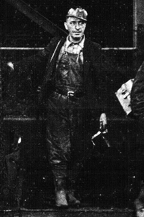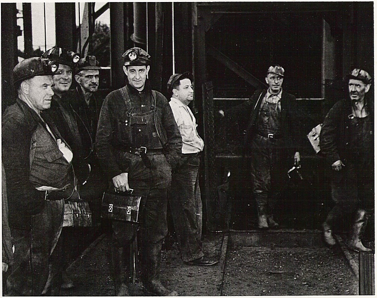 It seems that although our family had been banking at the First National for years, no one had paid any attention to the photos on the wall. The photo shows several miners coming off the colliery lift at one of the mines outside of town, I can't specify a date, but believe that the photos were taken sometime in the forties.